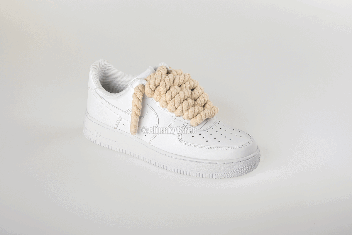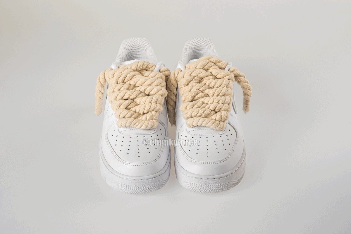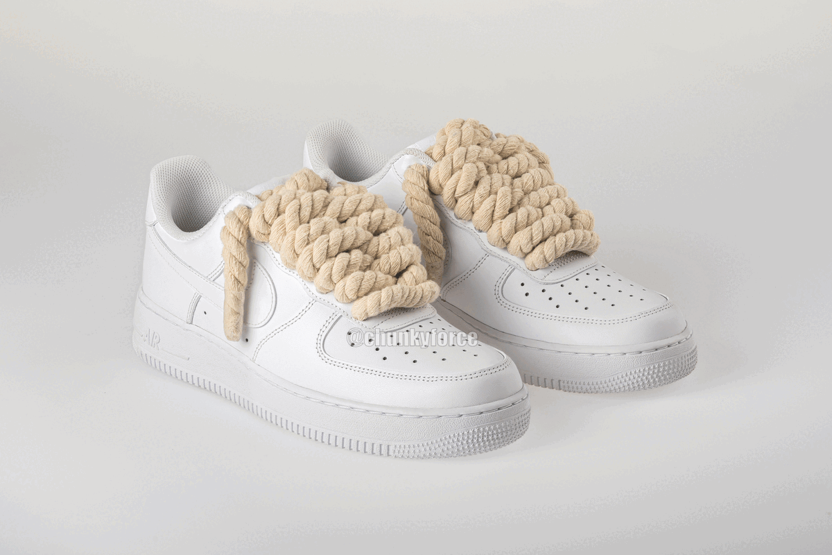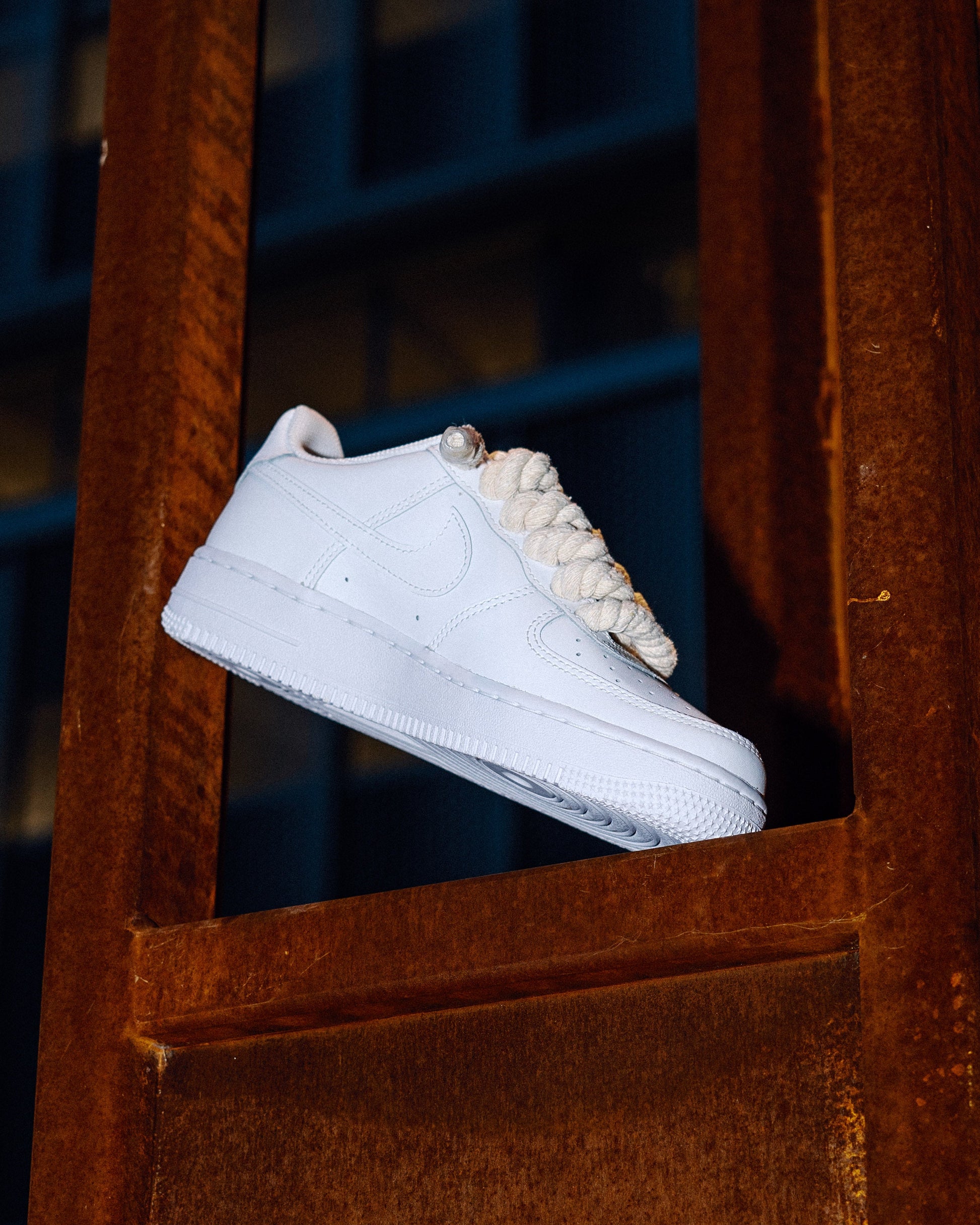 White Nike Air Force 1 featuring thick laces. Ends fully protected in a plastic cover to avoid unraveling. Shoes are included!